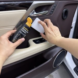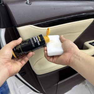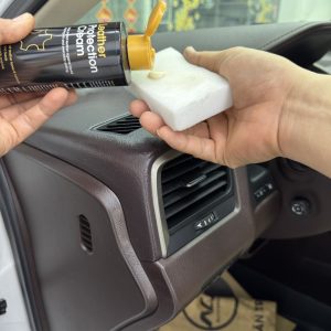 – Lắc đều chai bảo dưỡng ghế da, cho một ít kem vào khăn hoặc miếng xốp, gấp lại để sản phẩm trải đều và phủ lên ghế da và các chi tiết nội thất.