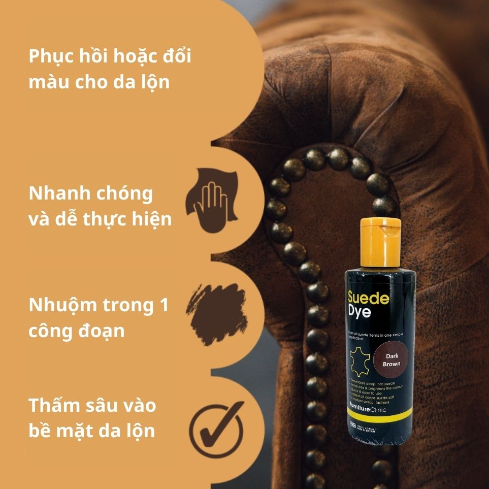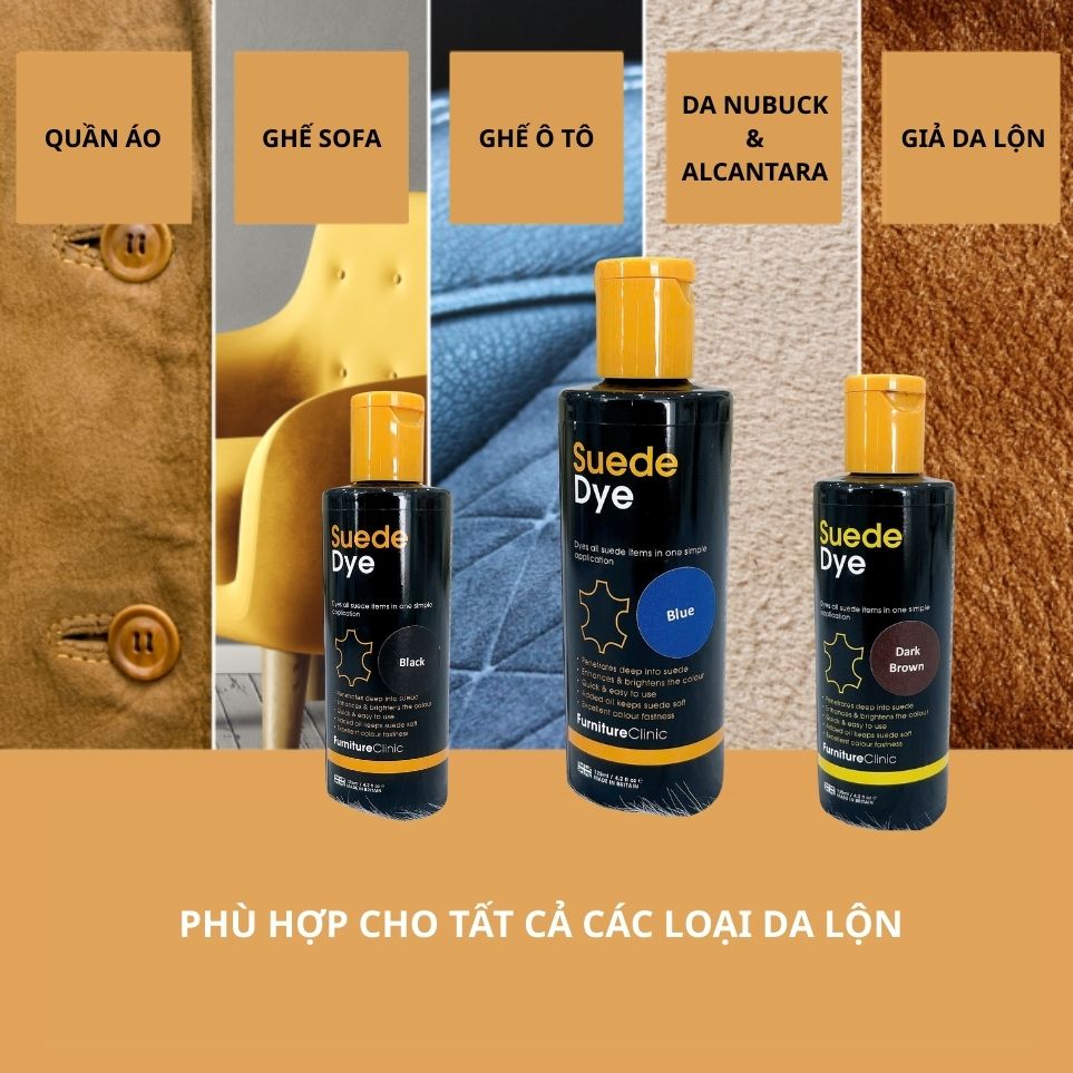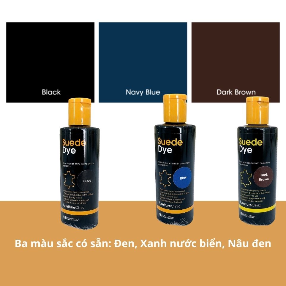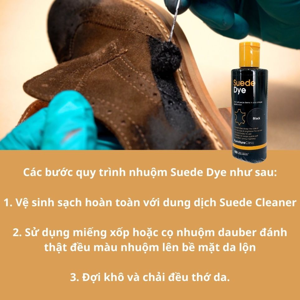 Màu nhuộm da lộn Suede Dye đậm đặc giúp nhuộm tất các món đồ da lộn chỉ trong một bước đơn giản